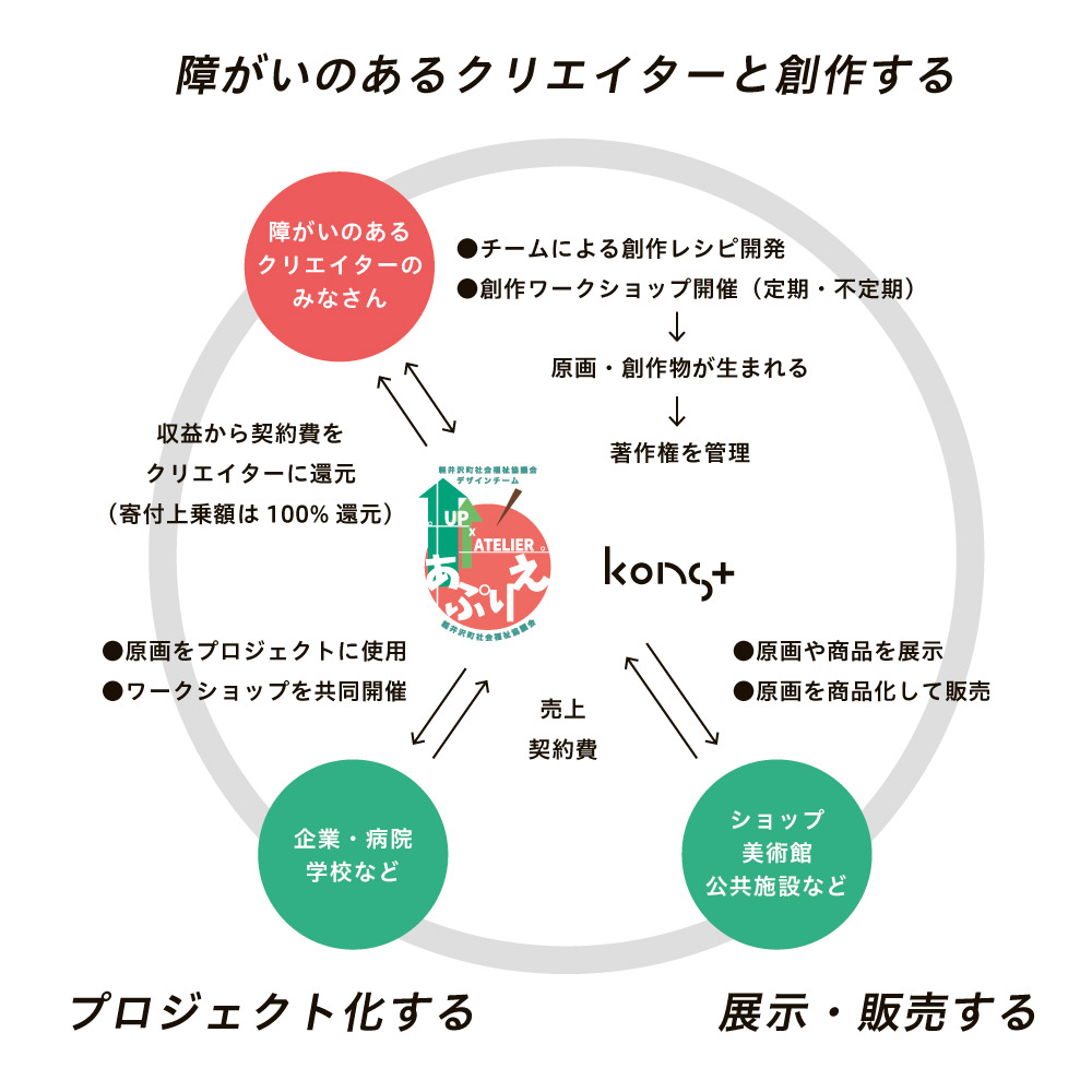 ワークショップの開催、原画の商品開発・販売、クリエイターへの還元など。